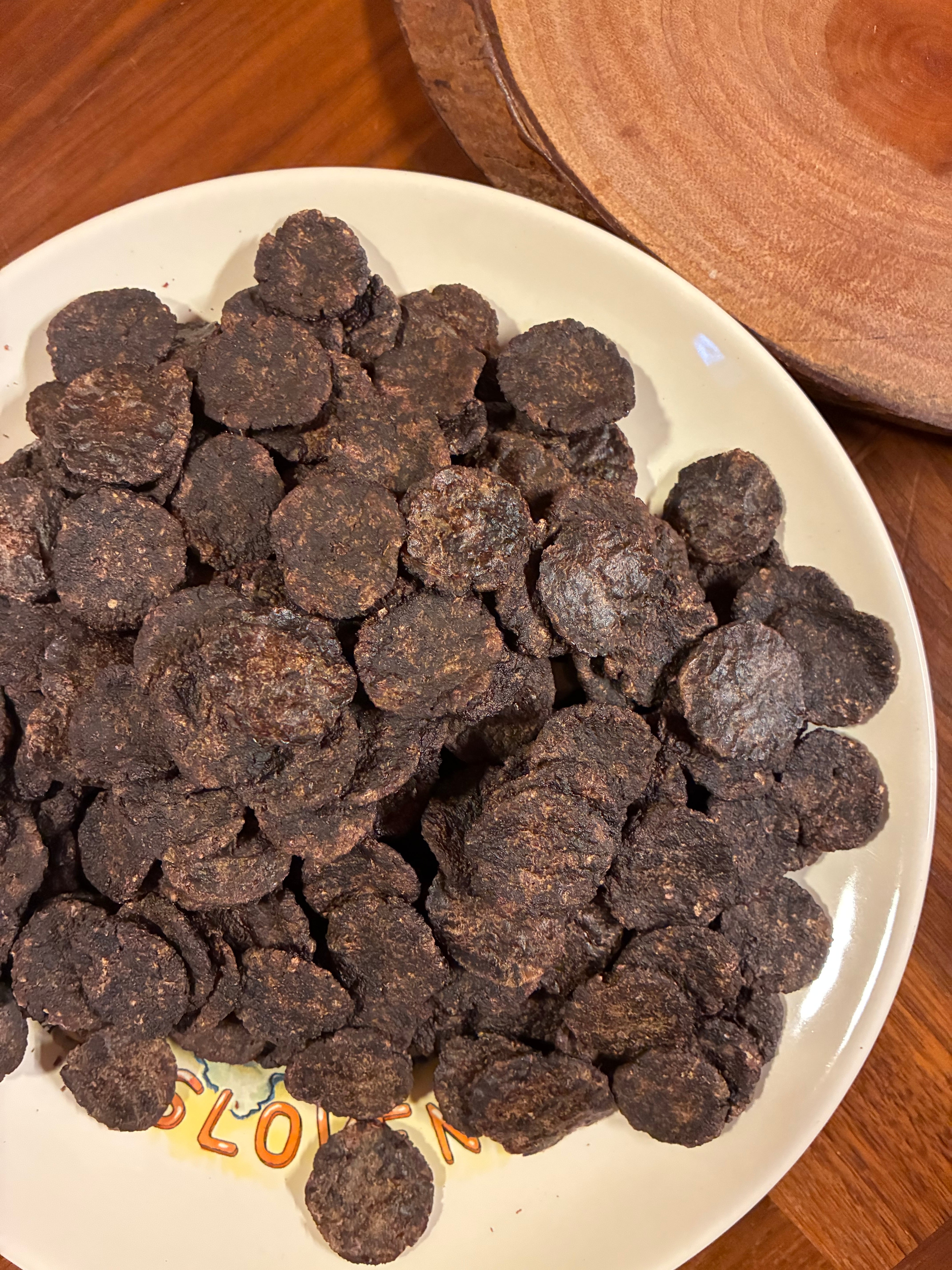 国産鹿肉ミンチとグリーントライプをミックスして手作業で薄めのチップスにしました!